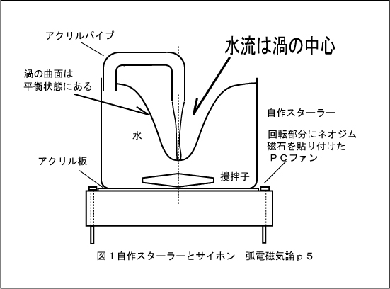 渦の作る曲面は平衡状態にあり、勾配を持ちます。この曲面に物質を置けば、物質は渦の底まで落ちて行くでしょう。通常は渦の底で安定となります。しかし、この模型では媒体である「水」そのものをサイホンによって落とし込むことで無限に続く水流を作っています。この模型は弧電磁気論を分かりやすく説明する比喩です。