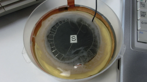 動画ではあまりはっきりしませんけれど、渦は磁石に近いほど速いです。 つまり、渦の動きの反作用は(-)電極であるネオジム磁石が受けていることになります。 そこで、(-)電極とネオジム磁石を分離してみます。ネオジム磁石がリング状なのは後の実験との都合により用いました。