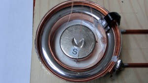内電極(-)として銅板をリング状にして上から0.2㎜のUEW線で吊り下げます。ねじれに対してかなり敏感で、電流を流すと食酢は反時計方向に渦を作るとともに内電極(-)は静止した6時の位置から最大10時の位置まで大きく振れました。実験3の結果