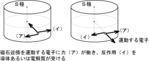 まず、図3の単極誘導モーターの場合について、図3左では磁石の軸に向かって電子が近づくとき軸に直交する向きに力(ア)が働き、その反作用(イ)は電極あるいは電解質が受けます。また図3の右においても同様に力が生じます。単極誘導において作用反作用が必ず成り立っています。