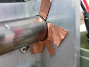 リニアシャフトに応じたリニアブッシュなんてありませんので、アルミ筐体のすりあわせには、薄い銅板を差し込みます。何としても・・。