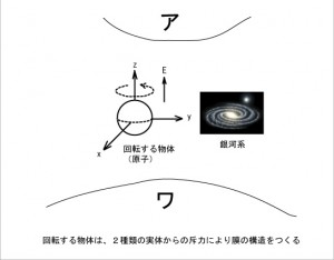 我々の存在する3次元物理空間(M軸)に直交するE軸上の実体は、「積分を伴って回転投影」されます。 これにより、物体が質量と位置を得ます。質量は実体が持つ真のエネルギー値に等しいです。