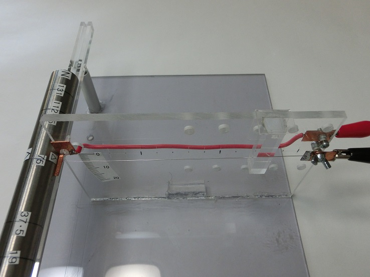 スズメッキ線は右端で支えてあり、力が生じるとは弾かれます。その後、線の弾性で銅片の位置まで戻ります。左端にある棒磁石を極方向にスライドさせることができます。磁石のS~Nの各位置での生じる力を目盛りをもとに計測します。それで得られたのが