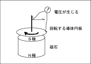 このようなものです。左側にあるのがU字型の磁石です。N極とS極の間を導体の円板が回転することで回転軸と外縁部の間に電圧が生じるという装置です。 それで驚いたのですが、一般的に単極誘導による起電力の説明には、