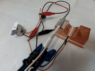 (1) 2個の銅ブロックでペルチェ素子を挟んで、一方のブロックに熱源(ハンダゴテ30Wのセラミックヒーター)を置きます。