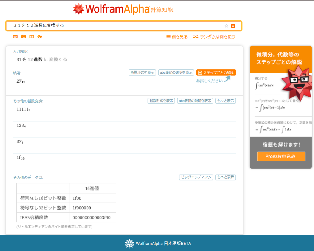 正しいのかどうかさえよくわかりません。そこで同氏にお教えいただいたWolfram Alpha計算知能(日本語版)で確かめました。 「31を12進数に変換する」と入力して得られたのが「2712」でした。また、47を12進数に変換したら「3b12」が得られました。