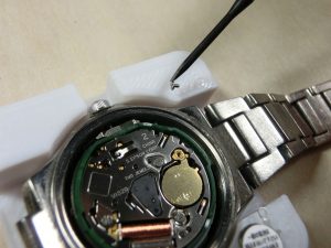 その前に、バンドを外しました。構造がよくわからず、運良くピンセットで押し出せました。これがバネ式ではありません。どうしたものか思案します。はめ方は後で。