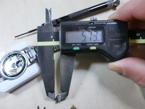 写真ではわかりにくいですが、新電池には黒い小さなパーツをはめ込んでいます。見たところ、端子の形とサイズは合っているようで、一安心。直径をノギスで測ってみました。古い電池が直径6.2ミリです。