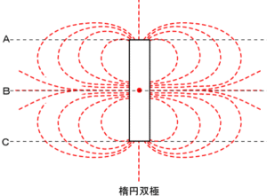 電磁誘導は双極(線対称)です。これを90度ずらして置いたのが楕円双極(赤い破線)だと気づきます。但し、楕円双極の形状は双極ですけれども、磁石の内部において点対称です。