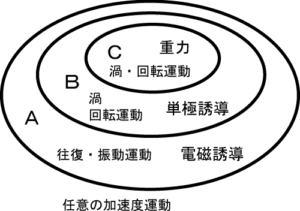 その内、電磁気現象に関連する加速度をAで示します。Aは往復運動、振動です。これが電磁誘導です。これとは別に単極誘導をBに示します。Bは本質的な回転運動(渦)ですして、加速度は一定です。