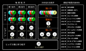 物理学では、物質粒子と力を媒介する粒子、それと質量を与えるヒッグス粒子(注)に分けています。これを標準理論と言います。