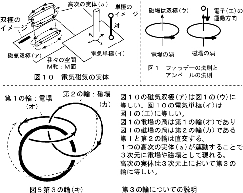 高次の実体は、我々に直交していると考える訳です。すると、図のように電場・磁場双方に直交する第3の輪を設ければ、磁場にも電場にも重ねられる、現れ得ることが分かります。高次の実体を考えるならば、第3の輪のようなものとして、3次元空間に現れると考えられるということです。